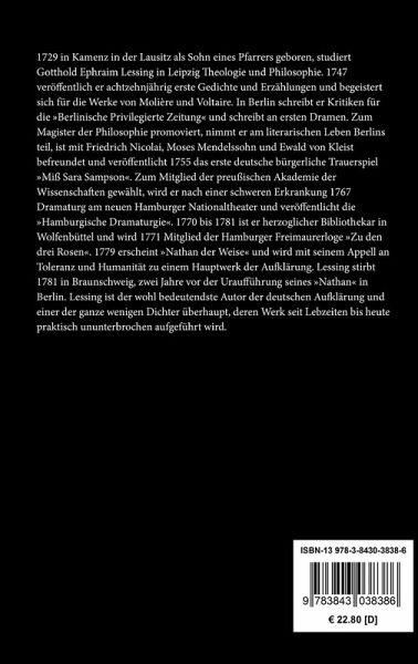 Gotthold Ephraim Lessing, Friedrich Nicolai, Moses Mendelssohn: Briefwechsel über das Trauerspiel Entstanden 1756/57, Erstdruck in: Sämmtliche Schriften, Berlin (Voss) 1794. Vollständige Neuausgabe mit einer Biographie des Autors. Herausgegeben von Karl-Maria Guth. Berlin 2014. Textgrundlage ist die Ausgabe: Gotthold Ephraim Lessing: Werke. Herausgegeben von Herbert G. Göpfert in Zusammenarbeit mit Karl Eibl, Helmut Göbel, Karl S. Guthke, Gerd Hillen, Albert von Schirmding und Jörg Schönert, Band 1¿8, München: Hanser, 1970 ff. Die Paginierung obiger Ausgabe wird in dieser Neuausgabe als Marginalie zeilengenau mitgeführt. Umschlaggestaltung von Thomas Schultz-Overhage unter Verwendung des Bildes: Drei Porträts von Anton Graff: Friedrich Nicolai, 1790; Gotthold Ephraim Lessing, 1771; Moses Mendelssohn , 1771. Gesetzt aus Minion Pro, 11 pt. Über den Autor: 1729 in Kamenz in der Lausitz als Sohn eines Pfarrers geboren, studiert Gotthold Ephraim Lessing in Leipzig Theologie und Philosophie. 1747 veröffentlich er achtzehnjährig erste Gedichte und Erzählungen und begeistert sich für die Werke von Molière und Voltaire. In Berlin schreibt er Kritiken für die »Berlinische Privilegierte Zeitung« und schreibt an ersten Dramen. Zum Magister der Philosophie promoviert, nimmt er am literarischen Leben Berlins teil, ist mit Friedrich Nicolai, Moses Mendelssohn und Ewald von Kleist befreundet und veröffentlicht 1755 das erste deutsche bürgerliche Trauerspiel »Miß Sara Sampson«. Zum Mitglied der preußischen Akademie der Wissenschaften gewählt, wird er nach einer schweren Erkrankung 1767 Dramaturg am neuen Hamburger Nationaltheater und veröffentlicht die »Hamburgische Dramaturgie«. 1770 bis 1781 ist er herzoglicher Bibliothekar in Wolfenbüttel und wird 1771 Mitglied der Hamburger Freimaurerloge »Zu den drei Rosen«. 1779 erscheint »Nathan der Weise« und wird mit seinem Appell an Toleranz und Humanität zu einem Hauptwerk der Aufklärung. Lessing stirbt 1781 in Braunschweig, zwei Jahre vor der Uraufführung seines »Nathan« in Berlin. Lessing ist der wohl bedeutendste Autor der deutschen Aufklärung und einer der ganze wenigen Dichter überhaupt, deren Werk seit Lebzeiten bis heute praktisch ununterbrochen aufgeführt wird.
