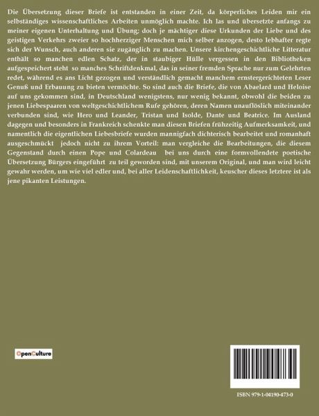 Die Übersetzung dieser Briefe ist entstanden in einer Zeit, da körperliches Leiden mir ein selbständiges wissenschaftliches Arbeiten unmöglich machte. Ich las und übersetzte anfangs zu meiner eigenen Unterhaltung und Übung; doch je mächtiger diese Urkunden der Liebe und des geistigen Verkehrs zweier so hochherziger Menschen mich selber anzogen, desto lebhafter regte sich der Wunsch, auch anderen sie zugänglich zu machen. Unsere kirchengeschichtliche Litteratur enthält so manchen edlen Schatz, der in staubiger Hülle vergessen in den Bibliotheken aufgespeichert steht so manches Schriftdenkmal, das in seiner fremden Sprache nur zum Gelehrten redet, während es ans Licht gezogen und verständlich gemacht manchem ernstergerichteten Leser Genuß und Erbauung zu bieten vermöchte. So sind auch die Briefe, die von Abaelard und Heloise auf uns gekommen sind, in Deutschland wenigstens, nur wenig bekannt, obwohl die beiden zu jenen Liebespaaren von weltgeschichtlichem Rufe gehören, deren Namen unauflöslich miteinander verbunden sind, wie Hero und Leander, Tristan und Isolde, Dante und Beatrice. Im Ausland dagegen und besonders in Frankreich schenkte man diesen Briefen frühzeitig Aufmerksamkeit, und namentlich die eigentlichen Liebesbriefe wurden mannigfach dichterisch bearbeitet und romanhaft ausgeschmückt jedoch nicht zu ihrem Vorteil: man vergleiche die Bearbeitungen, die diesem Gegenstand durch einen Pope und Colardeau bei uns durch eine formvollendete poetische Übersetzung Bürgers eingeführt zu teil geworden sind, mit unserem Original, und man wird leicht gewahr werden, um wie viel edler und, bei aller Leidenschaftlichkeit, keuscher dieses letztere ist als jene pikanten Leistungen.