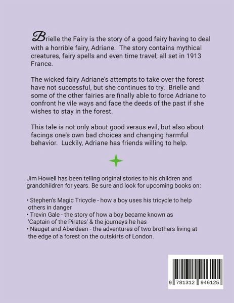 Brielle the Fairy is the story of a good fairy having to deal with a horrible fairy, Adriane. The story contains mythical creatures, fairy spells and time travel, all set in 1913 France. The evil fairy Adriane's attempts to take over the forest have not succeeded, but she continues to try. Brielle and other fairies are finally able to force Adriane to confront her vile ways and face the deeds of her past if she wishes to stay in the forest. This is a tale of not only good versus evil and facings one's own bad choices, but also trying to change harmful behaviors. Luckily, Adriane has new friends willing to help.