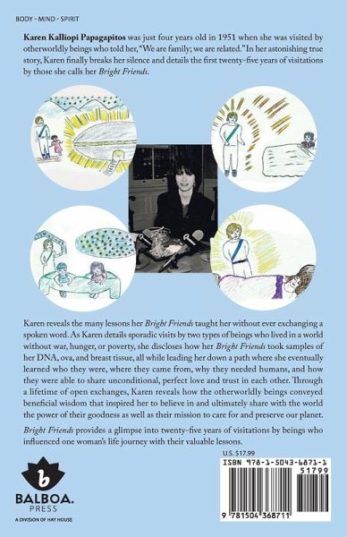 Karen Kalliopi Papagapitos was just four years old in 1951 when she was visited by otherworldly beings who told her, "We are family; we are related." In her astonishing true story, Karen finally breaks her silence and details the first twenty-five years of visitations by those she calls her Bright Friends. Karen reveals the many lessons her Bright Friends taught her without ever exchanging a spoken word. As Karen details sporadic visits by two types of beings who lived in a world without war, hunger, or poverty, she discloses how her Bright Friends took samples of her DNA, ova, and breast tissue, all while leading her down a path where she eventually learned who they were, where they came from, why they needed humans, and how they were able to share unconditional, perfect love and trust in each other. Through a lifetime of open exchanges, Karen reveals how the otherworldly beings conveyed beneficial wisdom that inspired her to believe in and ultimately share with the world the power of their goodness as well as their mission to care for and preserve our planet. Bright Friends provides a glimpse into twenty-five years of visitations by beings who influenced one woman’s life journey with their valuable lessons.