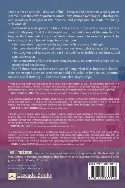 Hope is not an attitude--it's a way of life. Therapist Ted Brackman, a colleague of Jim Wallis in the early Sojourners community, mines psychological, theological, and sociological insights in this practical and compassionate guide for ""living well while ill."" Ted's work was deepened by his eleven years with pancreatic cancer (after a nine-month prognosis). He developed and lived out a way of life animated by hope in the transcendent reality of God's future coming to us in the present. In his writing, he is an honest, inspiring companion: - for those who struggle to face the next hour with courage and strength. - for those who feel defeated and need a new way forward that reframes the present. - for caregivers and advocates who need new tools for replenishing both internal and external resources. - for communities of faith seeking to bring change to, and empowering hope within, marginalized populations. For all those ready to find a new way of living when false hopes and distractions are stripped away, to learn how to build a foundation for personal, communal, and social thriving . . . Ted Brackman offers Bright Hope.