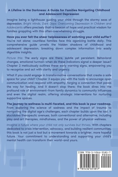 A Lifeline in the Darkness: A Guide for Families Navigating Childhood and Adolescent Depression Imagine being a lighthouse guiding your child through the stormy seas of depression. Bright Minds, Dark Days: Overcoming Depression in Children and Adolescents offers precisely that-a beacon of hope and practical wisdom for families grappling with this often-overwhelming struggle. Have you ever felt the sheer helplessness of watching your child suffer? You're not alone; countless families face this agonizing battle daily. This comprehensive guide unveils the hidden shadows of childhood and adolescent depression, breaking down complex information into easily digestible insights. Picture this: The early signs are there, subtle yet persistent. Behavioral changes, emotional turmoil-when do these indicators signal a deeper issue? Chapter 2 meticulously outlines these early warning signs, empowering you to recognize and act with clarity and urgency. What if you could engage in transformative conversations that create a safe space for your child? Chapter 3 equips you with the tools to encourage open communication and respond with empathy, forging a connection that paves the way for healing. And it doesn't stop there; the book dives into the profound role of environment-from family dynamics to community influences and even the digital realm, offering strategic interventions for nurturing supportive spaces. The journey to wellness is multi-faceted, and this book is your roadmap. From exploring the science of sadness and the impact of trauma to navigating the digital age's challenges, each chapter builds upon the last. It elucidates therapeutic avenues, both conventional and alternative, including play and art therapies, mindfulness, and the power of physical wellness. Imagine a future where your child not only survives but thrives. With chapters dedicated to crisis intervention, advocacy, and building resilient communities, this book is not just a tool but a movement towards a brighter, more hopeful future. Your commitment to understanding and supporting your child's mental health can transform their world-and yours.