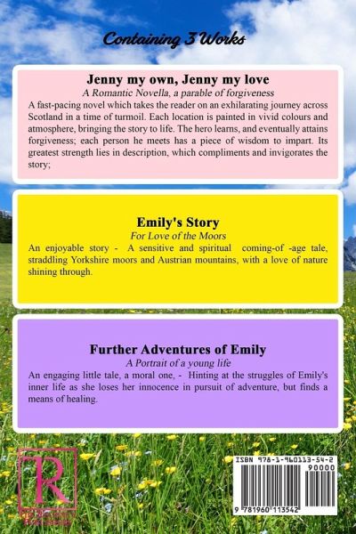 Jenny my own, Jenny my love A Romantic Novella, a parable of forgiveness A fast-pacing novel which takes the reader on an exhilarating journey across Scotland in a time of turmoil. Each location is painted in vivid colours and atmosphere, bringing the story to life. The hero learns, and eventually attains forgiveness; each person he meets has a piece of wisdom to impart. Its greatest strength lies in description, which compliments and invigorates the story; Emily's Story For Love of the Moors An enjoyable story - A sensitive and spiritual coming-of-age tale, straddling Yorkshire moors and Austrian mountains, with a love of nature shining through. Further Adventures of Emily A Portrait of a young life An engaging tale, a moral one, - Hinting at the struggles of Emily's inner life as she loses her innocence in pursuit of adventure, but finds a means of healing.