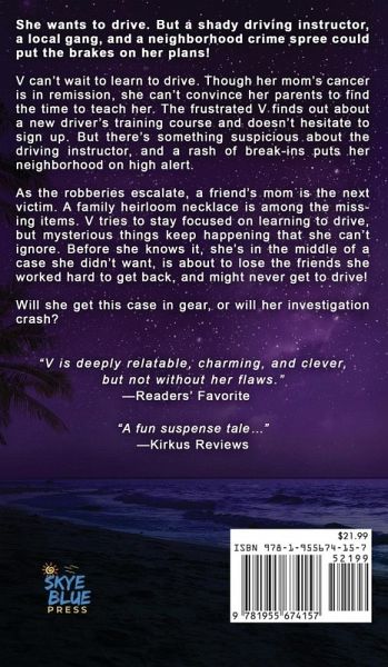 She wants to drive. But a shady driving instructor, a local gang, and a neighborhood crime spree could put the brakes on her plans! V can't wait to learn to drive. Though her mom's cancer is in remission, she can't convince her parents to find the time to teach her. Frustrated, she finds out about a new driver's training course and doesn't hesitate to sign up. But there's something suspicious about the driving instructor, and a rash of break-ins puts her neighborhood on high alert. As the burglaries escalate, a friend's mom is the next victim. A family heirloom necklace is among the missing items. V tries to stay focused on learning to drive, but mysterious things keep happening that she can't ignore. Before she knows it, she's in the middle of a case she didn't want, is about to lose the friends she worked hard to get back, and might never get to drive! Will she get this case in gear, or will her investigation crash?