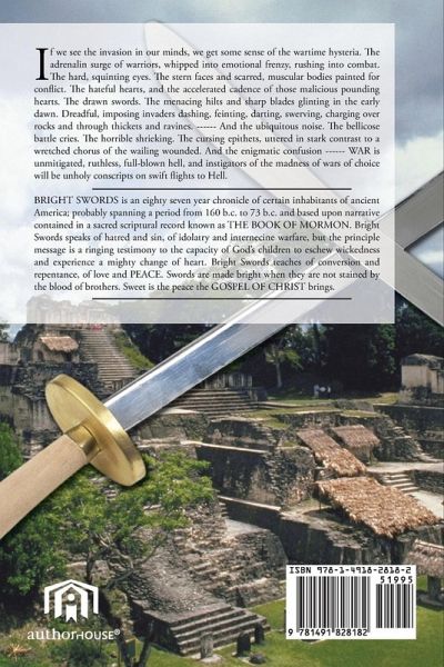 BRIGHT SWORDS is an eighty seven year chronicle of certain inhabitants of ancient America; probably spanning a period from 160 b.c. to 73 b.c. and based upon narrative contained in a sacred scriptural record known as THE BOOK OF MORMON. Bright Swords speaks of hatred and sin, of idolatry and internecine warfare, but the principle message is a ringing testimony to the capacity of God's children to eschew wickedness and experience a mighty change of heart. Bright Swords teaches of conversion and repentance, of love and PEACE. Swords are made bright when they are not stained by the blood of brothers. Sweet is the peace the GOSPEL OF CHRIST brings.
