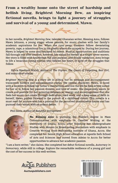 From a wealthy home onto the street of hardship and hellish living, Brightest Morning Dew, an inspiring fictional novella, brings to light a journey of struggles and survival of a young and determined, Mawu. She went through the path of the deepest hell to make her music dream a success. It's the story of Mawu's determination, motivation, and challenges to do whatever it takes to ensure her dream of becoming a great accomplished musician. Explore the remarkable resilience of a young girl and the cost of her success in this well-written novella by a creative and talented author, Blessing Amu.