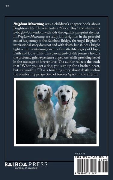 Brighton Mourning was a children's chapter book about Brighton's life. He was truly a "Good Boy" and shares his B-Right-On wisdom with kids through his pawprint rhymes. In Brighton Mourning, we sadly join Brighton in the peaceful end of his journey to the Rainbow Bridge. Yet Angel Brighton's inspirational story does not end with death, but shines a bright light on the continuing circuit of an afterlife legacy of Hope, Faith and Love. This transparent end-of-life journey honors the profound grief experience of pet loss, while providing belief in the message of forever love. The author reflects the truth that "When you get a dog, you sign up for a broken heart, but it's worth it." It is a touching story about death within the comforting perspective of forever Spirit in the afterlife.