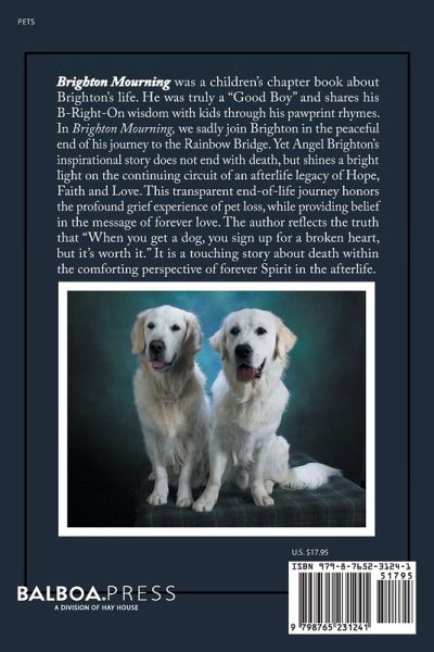 Brighton Mourning was a children's chapter book about Brighton's life. He was truly a "Good Boy" and shares his B-Right-On wisdom with kids through his pawprint rhymes. In Brighton Mourning, we sadly join Brighton in the peaceful end of his journey to the Rainbow Bridge. Yet Angel Brighton's inspirational story does not end with death, but shines a bright light on the continuing circuit of an afterlife legacy of Hope, Faith and Love. This transparent end-of-life journey honors the profound grief experience of pet loss, while providing belief in the message of forever love. The author reflects the truth that "When you get a dog, you sign up for a broken heart, but it's worth it." It is a touching story about death within the comforting perspective of forever Spirit in the afterlife.