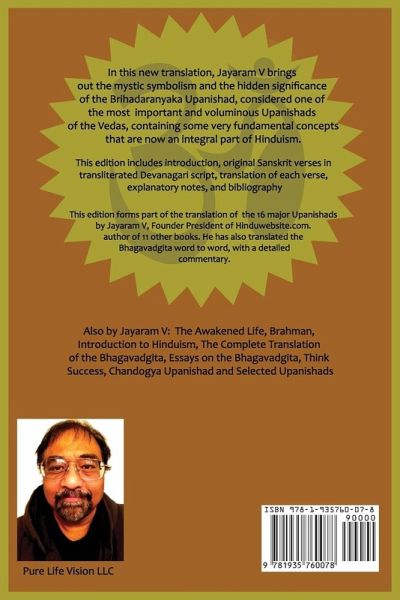 This is a complete translation of the Brihadaranyaka Upanishad, considered one of the most important and voluminous Upanishads of Hinduism, containing some very fundamental concepts that are now an integral part of Hinduism and the Vedanta Philosophy. Through his annotations and introduction, Jayaram V, who has dedicated 45 years to the study and understanding of India's religious and spiritual traditions, brings out the mystic symbolism and the hidden significance of the Upanishad. This vastly improved and revised edition includes an introduction, original Sanskrit verses in transliterated Devanagari script, a translation of each verse, explanatory notes, and a bibliography. Jayaram has translated 18 Upanishads, written a comprehensive commentary on the Bhagavadgita twice, and authored several books and articles. His other works include The Awakened Life, Brahman, Shiva Sutras: Mystic Knowledge Explained, Introduction to Hinduism, Essays on the Bhagavadgita, Sadhana Panchakam, Chandogya Upanishad, Selected Upanishads, Think Success, and Being the Best. He is the Founder and President of Hinduwebsite.com, where you can find most of his writings on various subjects.
