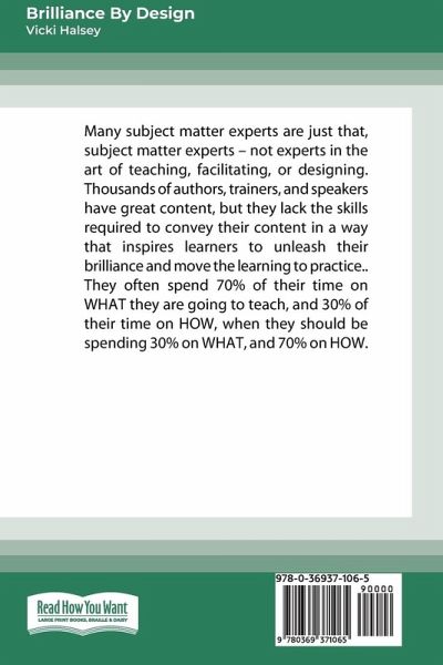 Many subject matter experts are just that, subject matter experts - not experts in the art of teaching, facilitating, or designing. Thousands of authors, trainers, and speakers have great content, but they lack the skills required to convey their content in a way that inspires learners to unleash their brilliance and move the learning to practice.. They often spend 70% of their time on WHAT they are going to teach, and 30% of their time on HOW, when they should be spending 30% on WHAT, and 70% on HOW. Their instructional techniques often are at odds with their message of inclusivity, eagerness for people to learn, and hopes that their content will change lives and organizations. ''Brilliance by Design'' outlines how to design learning interactions (such as meetings and workshops) that enable people to do their best thinking. Using the tested, signature ENGAGE model, it helps anyone who brings people together for the purpose of learning, problem - solving, or innovating to develop a clear, high - impact training design that unleashes brilliance. It presents a model that enables teachers to analyze learner and teacher needs, create objectives that meet those needs, and incorporate interactive tools that ''fire 'em up,'' ensuring all key outcomes are met. To help readers unleash the brilliance in others, this book provides the structure, tools, language, and models needed to create optimal learning experiences from their ideas, practices, models and books. In learning these techniques, readers will achieve powerful outcomes, building communities of learners who share best practices and communicate at a deep and profound level while doing real work.