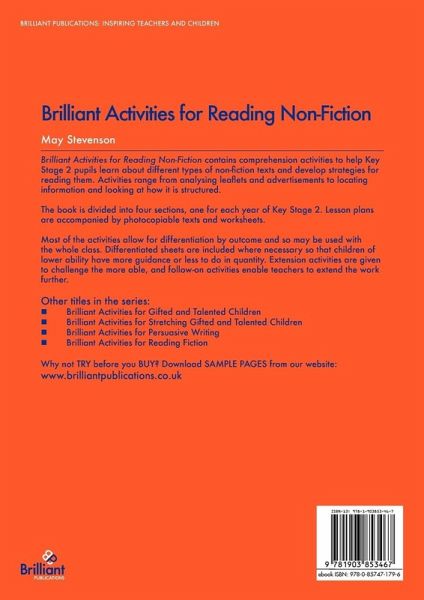Brilliant Activities for Reading Non-Fiction contains comprehension activities to help Key Stage 2 pupils learn about different types of non-fiction texts and develop strategies for reading them. All the activities are compatible with the Primary Literacy Strategy. Activities range from analysing leaflets and advertisements to locating information and looking at how it is structured. The book is divided into four sections, one for each year of key Stage 2. Lesson plans are accompanied by photocopiable texts and worksheets. Most of the activities allow for differentiation by outcome and so may be used with the whole class. Differentiated worksheets are included where necessary so that children of lower ability have more guidance or less to do in quantity. Extension activities are given to challenge the more able, and follow-on activities enable teachers to extend the work further.