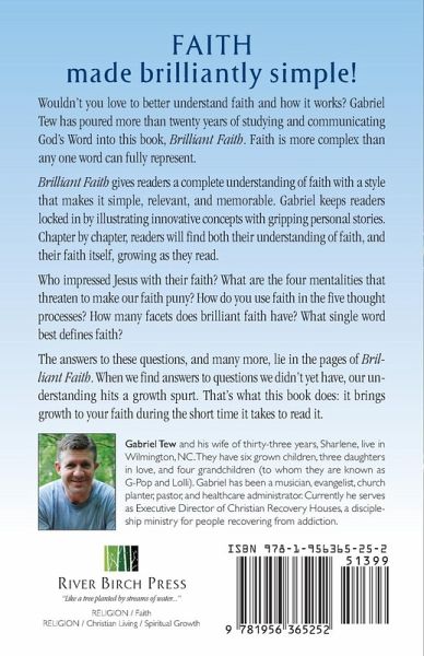 FAITH made brilliantly simple! Wouldn't you love to better understand faith and how it works? Gabriel Tew has poured more than twenty years of studying and communicating God's Word into this book, Brilliant Faith. Faith is more complex than any one word can fully represent. Brilliant Faith gives readers a complete understanding of faith with a style that makes it simple, relevant, and memorable. Gabriel keeps readers locked in by illustrating innovative concepts with gripping personal stories. Chapter by chapter, readers will find both their understanding of faith, and their faith itself, growing as they read. Who impressed Jesus with their faith? What are the four mentalities that threaten to make our faith puny? How do you use faith in the five thought processes? How many facets does brilliant faith have? What single word best defines faith? The answers to these questions, and many more, lie in the pages of Brilliant Faith. When we find answers to questions we didn't yet have, our understanding hits a growth spurt. That's what this book does: it brings growth to your faith during the short time it takes to read it.