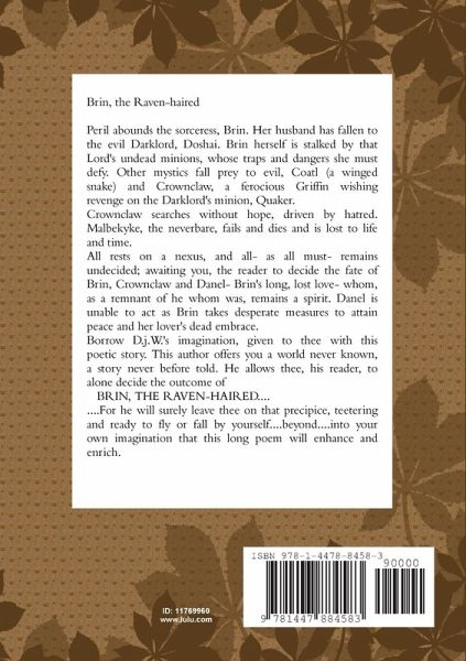Borrow D.j.W.'s imagination, given to thee with this poetic story. This author offers you a world never known, a story never before told. He allows thee, his reader, to decide the outcome. He will leave thee on a precipice, teetering and ready to fly or fall.... beyond.... into your own imagination, that this long poem will enhance and embrace.