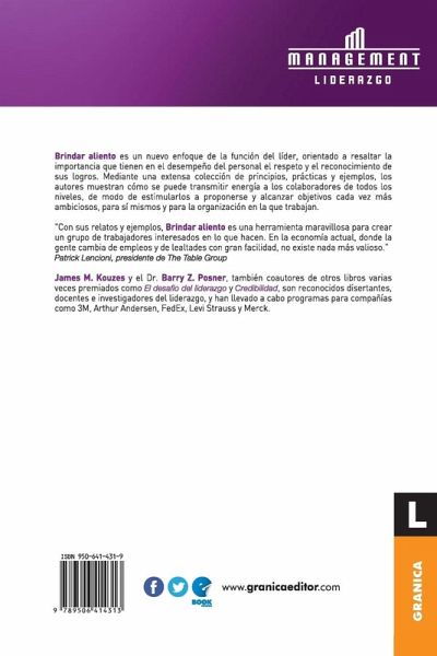 Brindar aliento constituye un novedoso enfoque de la función del líder, orientado a resaltar la importancia que tienen en el desempeño del personal el respeto y el reconocimiento de sus logros. Mediante una extensa colección de principios, prácticas y ejemplos, los autores muestran cómo se puede transmitir energía a los colaboradores de todos los niveles, de modo de estimularlos a proponerse y alcanzar objetivos cada vez más ambiciosos, para sí mismos y para la organización en la que trabajan. "Con sus relatos y ejemplos, Brindar aliento es una herramienta maravillosa para crear un grupo de trabajadores interesados en lo que hacen. En la economía actual, donde la gente cambia de empleos y de lealtades con gran facilidad, no existe nada más valioso." Patrick Lencioni, presidente de The Table Group. James M. Jouzes y el Dr. Barry Z. Posner, también coautores de otros libros varias veces premiados como El desafío del liderazgo y Credibilidad, son reconocidos disertantes, docentes e investigadores del liderazgo, y han llevado a cabo programas para compañías como 3M, Arthur Andersen, Fedex, Levi Strauss y Merck.