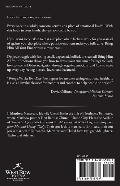 Every human being is emotional. Every once in a while, someone arrives at a place of emotional health. With this book in your hands, that person could be you. If you want to be taken to that rare place where feelings work for you instead of against you, that place where positive emotions make you fully alive, Bring Him All Your Emotions is a must-read. Do you struggle with feeling small, depressed, bullied, or shamed? Bring Him All Your Emotions shows you how to reveal your true inner feelings to God, how to receive Divine navigation through negative emotions, and how to wake up every day feeling blessed, loved, and balanced. "Bring Him All Your Emotions is great for anyone seeking emotional health. It is also an invaluable asset for mentors and coaches to help people be healed." -David Odhuno, Navigators Missions Director Nairobi, Kenya