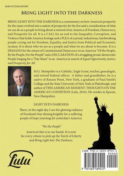 This is commentary on how America's prosperity for the many evolved into a nation of prosperity for the few and a consideration of what we can do as a people to bring about a renewal of an America of Freedom, Democracy, and Prosperity for all. It is a CALL for an end to the Inequality, Corruption, and Violence that holds America hostage and a PLEA of a proud, industrious, hardworking people crying out for Freedom, Equality, and Justice from Political and Economic tyranny. It is about who we are as a people and what we are about to become. It is a DEMAND for the return of Constitutional Democracy to an America "Of the People, By the People, For the People" and a DECLARATION of a struggling proud, democratic People longing for a "Fair Share" in an America in search of Equal Opportunity, Justice, and Prosperity for All. LIGHT INTO DARKNESS There, in the night sky, I see the glowing radiance of Freedom's Star shining brightly for a suffering people of hope yearning for yesterday's America.