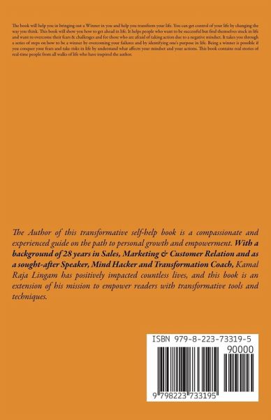 The book will help you in bringing out a Winner in you and help you transform your life. You can get control of your life by changing the way you think. This book will show you how to get ahead in life. It helps people who want to be successful but find themselves stuck in life and want to overcome their fears & challenges and for those who are afraid of taking action due to a negative mindset. It takes you through a series of steps on how to be a winner by overcoming your failures and by identifying one's purpose in life. Being a winner is possible if you conquer your fears and take risks in life by understand what affects your mindset and your actions. This book contains real stories of real-time people from all walks of life who have inspired the author.