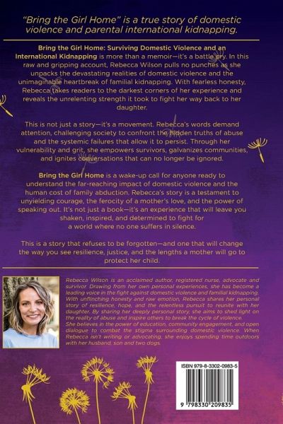 In "Bring the Girl Home: Surviving Domestic Violence and an International Kidnapping," acclaimed author and advocate Rebecca Wilson shares her harrowing story of resilience, hope, and the relentless pursuit to reunite with her daughter. With unflinching honesty and raw emotion, Rebecca sheds light on the dark reality of abuse and the devastating impact it has on individuals and families. Through her powerful narrative, she breaks the silence and stigma surrounding domestic violence, inspiring others to find their strength and break free from the cycle of violence. As a leading voice in the fight against domestic violence and familial kidnapping, Rebecca firmly believes in the power of education, community engagement, and open dialogue. Her unwavering dedication to this cause has earned her recognition as a leading advocate and a beacon of hope for countless individuals facing similar challenges. Beyond her advocacy work, Rebecca finds solace and rejuvenation in nature, spending time outdoors with her loved ones. Through her writing, advocacy, and personal journey, Rebecca continues to inspire and empower others to find their voice, stand against injustice, and create a world where violence no longer has a place.