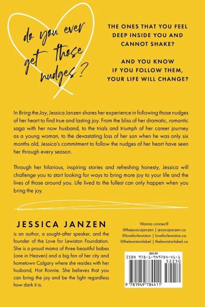 In Bring the Joy, Jessica Janzen shares her experience in following those nudges of her heart to find true and lasting joy. From the bliss of her dramatic, romantic saga with her now husband, to the trials and triumph of her career journey as a young women, to the devastating loss of her son when he was only six months old, Jessica's commitment to follow the nudges of her heart have seen her through every season. Through her hilarious, inspiring stories and refreshing honesty, Jessica will challenge you start looking for ways to brings more joy to your life and the lives of those around you. Life lived to the fullest can only happen when you bring the joy.
