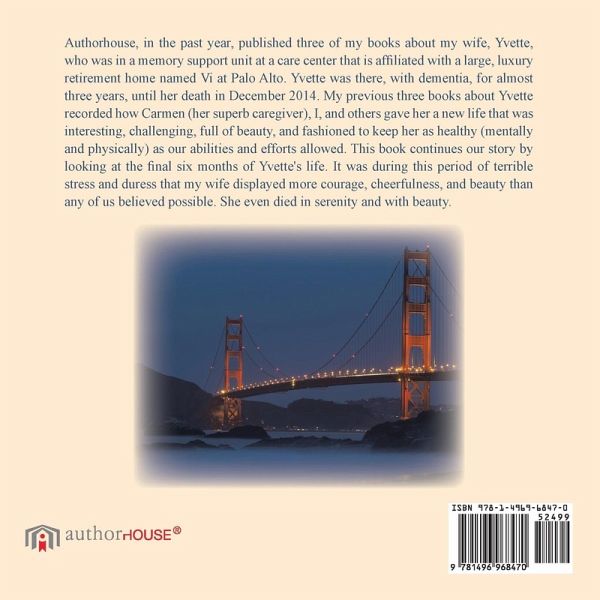 Authorhouse, in the past year, published three of my books about my wife, Yvette, who was in a memory support unit at a care center that is affiliated with a large, luxury retirement home named Vi at Palo Alto. Yvette was there, with dementia, for almost three years, until her death in December 2014. My previous three books about Yvette recorded how Carmen (her superb caregiver), I, and others gave her a new life that was interesting, challenging, full of beauty, and fashioned to keep her as healthy (mentally and physically) as our abilities and efforts allowed. This book continues our story by looking at the final six months of Yvette's life. It was during this period of terrible stress and duress that my wife displayed more courage, cheerfulness, and beauty than any of us believed possible. She even died in serenity and with beauty.