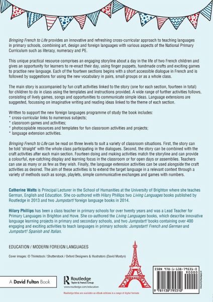 Bringing French to Life provides an innovative and refreshing cross-curricular approach to teaching languages in primary schools, combining art, design and foreign languages with various aspects of the National Primary Curriculum such as Literacy, Numeracy and PE. This unique practical resource comprises an engaging storyline about a day in the life of two French children and gives an opportunity for learners to re-enact their day, using finger puppets, handmade crafts and exciting games to practise new language. Each of the 14 sections begins with a short accessible dialogue in French and is followed by suggestions for using the new vocabulary in pairs, small groups or as a whole class. The main story is accompanied by fun craft activities linked to the story (one for each section, ie 14 in total) for children to create in class using the templates and instructions provided. A wide range of further activities follows, consisting of lively games, songs and opportunities to communicate simple ideas. Language extensions are suggested, focussing on imaginative writing and reading ideas linked to the theme of each section. Written to support the new foreign languages programme of study the book also includes:¿ * Cross-curricular links to numerous subjects including Literacy, Numeracy, PE and ICT¿ * Classroom games and activities¿ * Photocopiable resources and templates for fun classroom activities and projects¿ * Language extension activities.¿ Bringing French to Life can be read on three levels to suit a variety of classroom situations. First, the story can be told 'straight' with the whole class participating in the¿dialogues. Second, the story can be combined with the craft activities after each main section. 14 doing and making activities match the storyline and provide a colourful, eye catching display and learning focus in the classroom or for Open Days or Assemblies. Teachers can use as many or as few as they wish. The resultant crafts can be used for very effective classroom displays/open days/assemblies etc. Finally, the language extension activities can be used alongside the art/craft/design activities as desired. The aim of these activities is to extend the target language in a relevant context through a variety of methods such as songs, playlets, simple communicative exchanges, games with numbers etc.¿