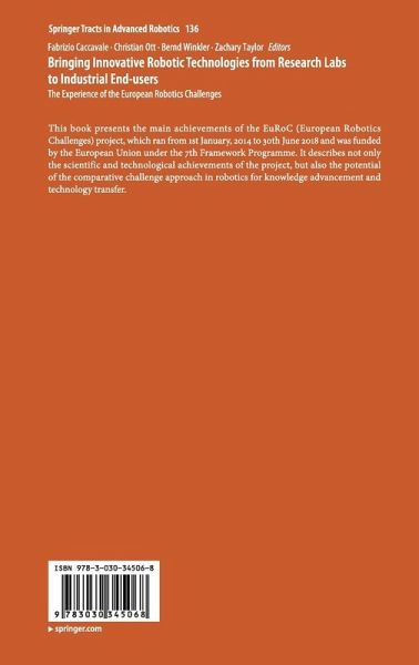 Bringing innovative robotic technologies from research labs to industrial end-users.- Part I: The EuRoC project: A general perspective.- The EuRoC project: motivations and design of the Challenges.- Evaluation and selection activities in EuRoC: innovations and lessons learned.- The EuRoC platforms.- Part II: Achievements in Challenge 1: Reconfigurable Interactive Manufacturing Cell.- PIROS: Cooperative, safe and reconfigurable robotic companion for CNC pallets load/unload stations.