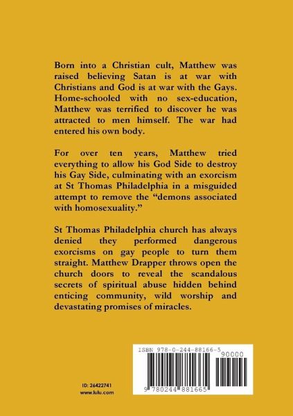 Born into a Christian cult, Matthew was raised believing Satan is at war with Christians and God is at war with the Gays. Home-schooled with no sex-education, Matthew was terrified to discover he was attracted to men himself. The war had entered his own body. For over ten years, Matthew tried everything to allow his God Side to destroy his Gay Side, culminating with an exorcism at St Thomas Philadelphia in a misguided attempt to remove the "demons associated with homosexuality." St Thomas Philadelphia church has always denied they performed dangerous exorcisms on gay people to turn them straight. Matthew Drapper throws open the church doors to reveal the scandalous secrets of spiritual abuse hidden behind enticing community, wild worship and devastating promises of miracles.