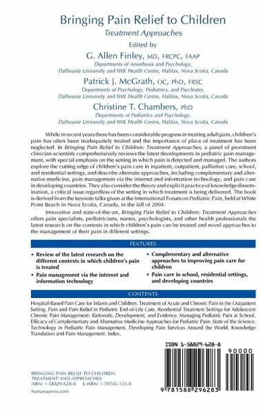 While in recent years there has been considerable progress in treating adult pain, children's pain has often been inadequately treated and the importance of place of treatment has been neglected. In Bringing Pain Relief to Children: Treatment Approaches, a panel of prominent clinician-scientists comprehensively reviews the latest developments in pediatric pain management, with special emphasis on the setting in which pain is detected and managed. The authors explore the cutting-edge of children's pain care in inpatient, outpatient, palliative care, school, and residential settings, and describe alternate approaches, including complementary and alternative medicine, pain management via the internet and information technology, and pain care in developing countries. They also consider the theory and explicit practice of knowledge dissemination, a critical issue regardless of the setting in which treatment is being delivered. The book is derived from the keynote talks given at the International Forum on Pediatric Pain, held at White Point Beach in Nova Scotia, Canada, in the fall of 2004.