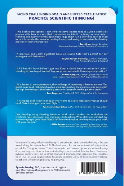 FACING CHALLENGING GOALS AND UNPREDICTABLE PATHS?PRACTICE SCIENTIFIC THINKING! Your team's ability to learn and adapt is paramount, and scientific thinking is the key to unlocking this invaluable skill. The bad news: It's not our natural default position as adults. The good news: There's a simple and proven approach to developing it in any organization or team-including yours-called Toyota Kata. Professor Sylvain Landry lays out a straightforward management practice that enables each level of your organization to apply scientific ways of thinking and working, to achieve whatever goals you're pursuing."This book is that good!!! I can't wait to have leaders read it! Sylvain shares his journey with Kata in a way that transported me into it. He brings a clear understanding and a powerful message on how to go about it, in a short and easy-to-read format. I consider this essential reading for anyone looking to start scientific-thinking practice in their organization."- Tony Hren, Senior Director,Danaher Business System, Danaher Corporation "A practical and easily digestible book on Toyota Kata that's perfect for our managers and their teams."- Kasper Bødker Mejlvang, General Manager,Novo Nordisk Denmark & Iceland"Sylvain Landry captures the essence of developing practical, everyday scientific thinking that powers up your team, intertwined with the fascinating psychology behind it."- Timothy McQueen, General Manager, GE Aviation "If I'd had this book before I got into Kata it would have increased my understanding of how to get started. A great precursor to initial training and practice."- Andrea Simpson, Senior Operations Director and Process Improvement, NEA Baptist Health System "As a leader of an organization, the challenge of improving is hard to sustain. This MUST-read book highlights how top organizations fuel their journey, and even enjoy the trip, by managers shepherding practice of scientific thinking in their teams."- Dan Bergeron, President & CEO of SigmaPoint Technologies "A compact book every manager who wants to coach high performance should read. Take it along on your next flight."- Professor Jeffrey Liker, author of the bestseller The Toyota Way "We develop many thinking habits at work, which makes the workplace the world's largest classroom and managers its teachers. What skills and mindset are you conveying in your team? Read this book and realize how important your work with your team is."- Mike Rother, author of the bestselling Learning to See,Toyota Kata and The Toyota Kata Practice Guide