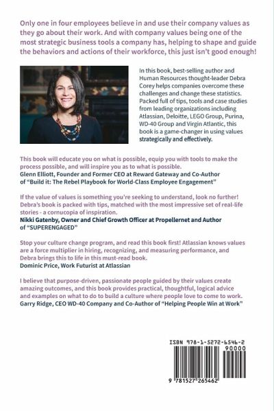 Only one in four employees believe in and use their company values as they go about their work. And with company values being one of the most strategic business tools a company has, helping to shape and guide the behaviors and actions of their workforce, this just isn't good enough!In this book, best-selling author and Human Resources thought-leader Debra Corey helps companies overcome these challenges and change these statistics. Packed full of tips, tools and case studies from leading organizations including Atlassian, Deloitte, LEGO Group, Purina, WD-40 Group and Virgin Atlantic, this book is a game-changer in using values strategically and effectively. You'll get insights into how companies can and have moved away from generic and meaningless values to ones that provide strategic direction, focus and motivation. You'll learn how to bring your values "out to play" by embedding them into everything you do, being so much a part of how you operate that even if they're nowhere in sight, your employees would know, believe in, and live them in their behaviors and actions.