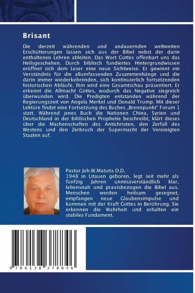 Die derzeit währenden und andauernden weltweiten Erschütterungen lassen sich aus der Bibel nebst der darin enthaltenen Lehren ableiten. Das Wort Gottes offenbart uns das Heilsgeschehen. Durch biblisch fundiertes Hintergrundwissen eröffnet sich dem Leser eine neue Sichtweise. Er gewinnt ein Verständnis für die allumfassenden Zusammenhänge und die darin immer wiederkehrenden, sich kontinuierlich fortsetzenden historischen Abläufe. Ihm wird eine Gesamtschau präsentiert. Er erkennt die Allmacht Gottes, wodurch das Negative siegreich überwunden wird. Die Predigten entstanden während der Regierungszeit von Angela Merkel und Donald Trump. Mit dieser Lektüre findet eine Fortsetzung des Buches "Brennpunkt" Forum 1 statt. Während jenes Buch die Nationen China, Syrien und Deutschland in der biblischen Prophetie beschreibt, klärt dieses über die Machenschaften des Antichristen, den Zerfall des Westens und den Zerbruch der Supermacht der Vereinigten Staaten auf.