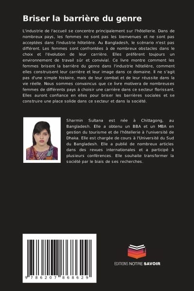 L'industrie de l'accueil se concentre principalement sur l'hôtellerie. Dans de nombreux pays, les femmes ne sont pas les bienvenues et ne sont pas acceptées dans l'industrie hôtelière. Au Bangladesh, le scénario n'est pas différent. Les femmes sont confrontées à de nombreux obstacles dans le choix et l'évolution de leur carrière. Elles préfèrent toujours un environnement de travail sûr et convivial. Ce livre montre comment les femmes brisent la barrière du genre dans l'industrie hôtelière, comment elles construisent leur carrière et leur image dans ce domaine. Il ne s'agit pas d'une simple histoire, mais de leur combat et de leur réussite dans la vie réelle. Nous sommes convaincus que ce livre motivera de nombreuses femmes de différents pays à choisir une carrière dans ce secteur florissant. Elles auront confiance en elles pour briser les barrières sociales et se construire une place solide dans ce secteur et dans la société.