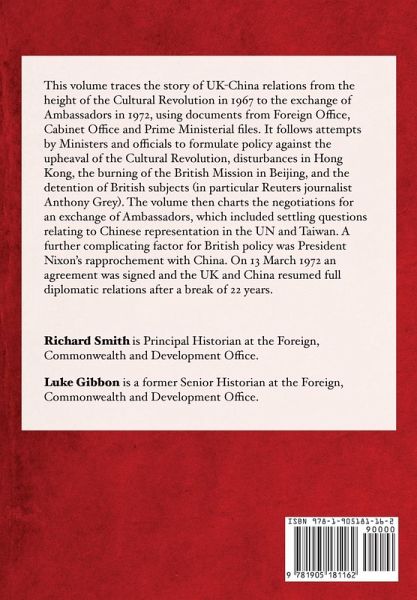 The volume traces the story of UK-China relations from the height of the Cultural Revolution in 1967 to the exchange of Ambassadors in 1972, using British government documents. It follows attempts by Ministers and officials to formulate policy against the upheaval of the Cultural Revolution, disturbances in Hong Kong, the burning of the British Mission in Beijing and the detention of British subjects (in particular Reuters journalist Anthony Grey). The volume then charts negotiations for an exchange of Ambassadors, a process complicated by President Nixon's rapprochement with China. On 13 March 1972 an agreement was signed and the UK and China resumed full diplomatic relations after a break of 22 years.