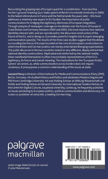 List of Tables and Figures Preface PART I: INTRODUCTION 1. The EU, the Nation State and the News Media 2. Scope of the Book 3. Plan of the Book PART II: THEORETICAL PERSPECTIVES 4. The Social Construction of Europe - a New Focus for Theory and Research 5. Democracy and Legitimacy at the EU level 6. Democracy and Communication 7. The Nexus of Communication, Legitimacy and Identity PART III: THE EUROPEAN PUBLIC SPHERE 8. The European Public Sphere, Brussels and the Media 9. A European Public Sphere or a European Sphere of Publics? PART IV: RESEARCH DESIGN AND METHODOLOGY 10. Discursive Conditions for a Europeanisation of Public Spheres 11. The News Media as Subject of Analysis 12. The Communicative Event under Study: The Future of Europe Debate PART V: IDENTITIES IN PERSPECTIVE: TWO DIFFERENT HISTORICAL RELATIONSHIPS TO EUROPE 13. Introduction 14. Britain 15. Germany 16. Concluding Remarks PART VI: THE DISCURSIVE REPRESENTATION OF THE FUTURE OF EUROPE PROCESS 17. Joschka Fischer's Humboldt Speech (2000) 18. The Presentation of the Convention Results (2003) 19. The Reactions to the Rejection of the Constitutional Treaty (2005) PART VII: CONCLUSION 20. Britain and Germany Imagining the Future of Europe 21. Implications for the 'European Sphere of Publics' Bibliography I. Primary Sources Official Documents Official Speeches Additional Media Sources II. Secondary Literature Index
