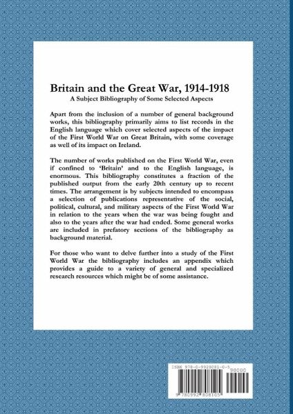 In the main body of this bibliography will be found works relevant to a study of the Great War in Britain on a range of aspects such as the armed services, the civilian front, industry, politics, propaganda, and the media during the years of the war. Cultural aspects are covered by the inclusion of works on art, literature, music, the cinema, and the theatre relating not only to the years when the war was in progress but also to the years after the war had ended. Some general works and works of relevance specifically to the pre-war years are included in prefatory sections of the bibliography…mehr