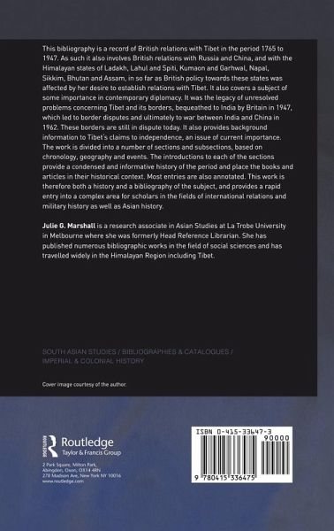 This bibliography is a record of British relations with Tibet in the period from 1765 to 1947. It also provides background information to Tibet's claims to independence, an issue of current importance. The work is divided into a number of sections and subsections, based on chronology, geography and events. The introductions to each of the sections provide a condensed and informative history of the period and place the books and articles in their historical context. This work is both a history and a bibliography of the subject, and provides a rapid entry into a complex area for scholars in the fields of international relations and military history as well as Asian history.