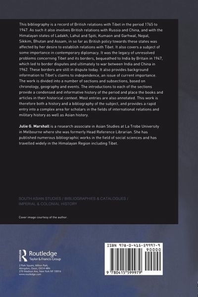 This bibliography is a record of British relations with Tibet in the period from 1765 to 1947. It also provides background information to Tibet's claims to independence, an issue of current importance. The work is divided into a number of sections and subsections, based on chronology, geography and events. The introductions to each of the sections provide a condensed and informative history of the period and place the books and articles in their historical context. This work is both a history and a bibliography of the subject, and provides a rapid entry into a complex area for scholars in the fields of international relations and military history as well as Asian history.