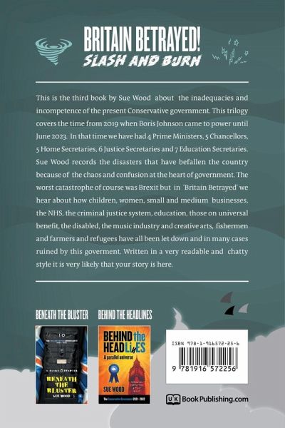 'Britain Betrayed' is the third book in the trilogy by Sue Wood about the shortcomings and inadequacies of this Conservative government. Written as a diary she has recounted day by day and sometimes hour by hour, the negligence and corruption and self-interest of a Tory government who believe that there is one law for us and no law whatsoever for them. Your story could well be here as she writes about the NHS, our children, women, small businesses, the criminal courts,Con farmers and the fishing industry, the arts, hospitality, and refugees. She exposes ministers who break the ministerial code, who bring in draconian new laws, who are accused of bullying tactics and who use inflammatory and provocative language. The premierships of Boris Johnson, Liz Truss and Rishi Sunak are all written about in a chatty style which is very easy to read. This is an important historical account for anyone who asks why this Tory government failed. The reasons are all here.