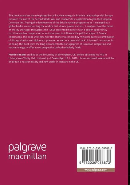 This book examines the role played by civil nuclear energy in Britain's relationship with Europe between the end of the Second World War and London's first application to join the European Communities. Tracing the development of the British nuclear programme as it emerged as a global leader in constructing the world's first atomic power stations, it analyses how the threat of energy shortages throughout the 1950s presented ministers with a golden opportunity to utilise nuclear cooperation as an instrument to influence the political shape of Europe. Importantly, this book will show how this chance was missed by ministers due to a combination of disorganization and diplomatic pressure, as well as a perennial lack of domestic resources. In so doing, this book joins the long-disconnected historiographies of European integration and nuclear energy to offer a new perspective on both scholarly fields.