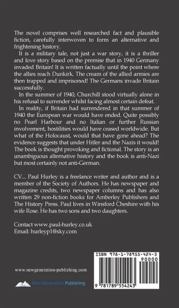 The novel comprises well researched fact and plausible ¿ ction, carefully interwoven to form an alternative and frightening history. It is a military tale, not just a war story, it is a thriller and love story based on the premise that in 1940 Germany invaded Britain! It is written factually until the point where the allies reach Dunkirk. The cream of the allied armies are then trapped and imprisoned! The Germans invade Britain successfully. In the summer of 1940, Churchill stood virtually alone in his refusal to surrender whilst facing almost certain defeat. In reality, if Britain had surrendered in that summer of 1940 the European war would have ended. Quite possibly no Pearl Harbour and no Italian or further Russian involvement, hostilities would have ceased worldwide. But what of the Holocaust, would that have gone ahead? The evidence suggests that under Hitler and the Nazis it would! The book is thought provoking and ¿ ctional. The story is an unambiguous alternative history and the book is anti-Nazi but most certainly not anti-German. CV... Paul Hurley is a freelance writer and author and is a member of the Society of Authors. He has newspaper and magazine credits, two newspaper columns and has also written 29 non-¿ ction books for Amberley Publishers and The History Press. Paul lives in Winsford Cheshire with his wife Rose. He has two sons and two daughters. Contact www.paul-hurley.co.uk Email: hurleyp1@sky.com