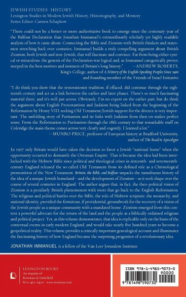 This volume examines the unique historical and religious forces that led to the Balfour Declaration and argues that Britain, for more than two centuries, already possessed the ingredients for a theopolitical vision of a Jewish home state.