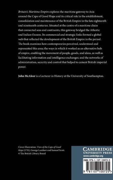 A fascinating new study in which John McAleer explores the maritime gateway to Asia around the Cape of Good Hope and its critical role in the establishment, consolidation and maintenance of the British Empire in the late eighteenth and nineteenth centuries. Situated at the centre of a maritime chain that connected seas and continents, this gateway bridged the Atlantic and Indian Oceans, which, with its commercial links and strategic requirements, formed a global web that reflected the development of the British Empire in the period. The book examines how contemporaries perceived, understood and represented this area; the ways in which it worked as an alternative hub of empire, enabling the movement of people, goods, and ideas, as well as facilitating information and intelligence exchanges; and the networks of administration, security and control that helped to cement British imperial power.
