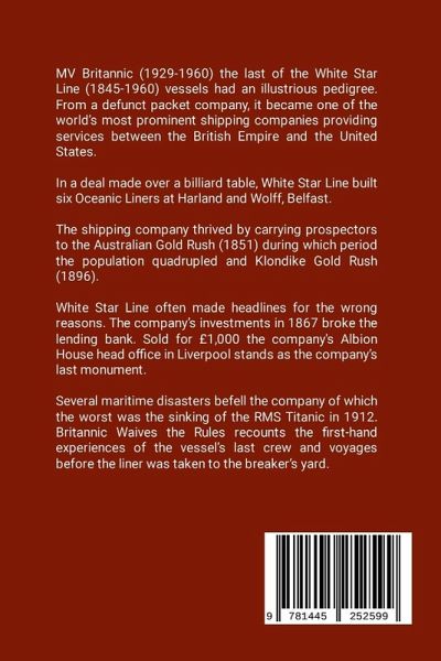 MV Britannic (1929-1960) the last of the White Star Line (1845-1960) vessels had an illustrious pedigree. From a defunct packet company, it became one of the world's most prominent shipping companies providing services between the British Empire and the United States. In a deal made over a billiard table, White Star Line built six Oceanic Liners at Harland and Wolff, Belfast. The shipping company thrived by carrying prospectors to the Australian Gold Rush (1851) during which period the population quadrupled and Klondike Gold Rush (1896). White Star Line often made headlines for the wrong reasons. The company's investments in 1867 broke the lending bank. Sold for £1,000 the company's Albion House head office in Liverpool stands as the company's last monument. Several maritime disasters befell the company of which the worst was the sinking of the RMS Titanic in 1912. Britannic Waives the Rules recounts the first-hand experiences of the vessel's last crew and voyages before the liner was taken to the breaker's yard.