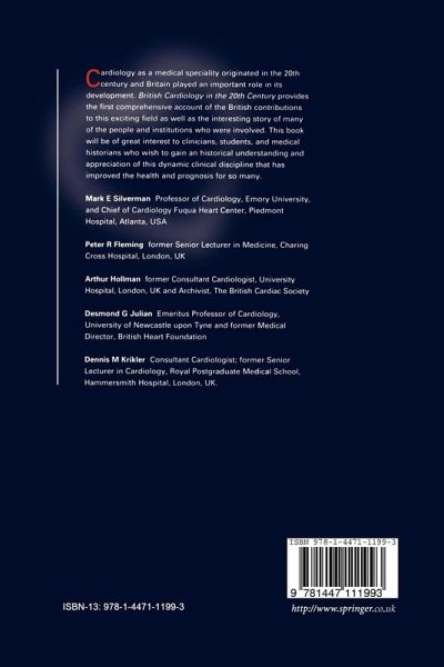 1 British Cardiology 1900-50.- Heart failure.- Cardiac arrhythmias.- Conduction defects.- Electrocardiography.- Ischaemic heart disease.- Angina.- Myocardial infarction.- Chronic rheumatic heart disease.- Infections of the heart.- Hypertensive heart disease.- Pulmonary heart disease.- Congenital heart disease.- Da Costa's syndrome and related conditions.- The Development of the Speciality.- 2 The Second World War and the NHS - the Framework for the Development of Cardiology.- 3 The Training, Number, and Distribution of Cardiologists.- The Organisations Involved in the Growth of Cardiology.- 4 Societies, Journals, and Books.- 5 The British Heart Foundation.- 6 Part I. The National Heart Hospital: The First of its Kind.- II. The Institute of Cardiology and the National Heart and Lung Institute.- 7 The Hammersmith Hospital and the Royal Postgraduate Medical School.- Diagnosis and Treatment in Cardiology.- 8 Bedside Diagnosis.- 9 The Chest X Ray in Cardiac Diagnosis, 1930-60.- 10 Electrocardiography, Electrophysiology, and Arrhythmias.- 11 Cardiac Catheterisation.- 12 Nuclear Medicine and Cardiology.- 13 Cardiovascular Magnetic Resonance.- 14 The Development of Cardiac Ultrasound.- 15 Prevention of Heart Disease.- 16 Cardiac Surgery.- 17 Cardiac Pacing.- 18 Cardiac Rehabilitation.- 19 Clinical Trials.- Selected Cardiac Disorders.- 20 Cardiovascular Pathology.- 21 Paediatric Cardiology.- 22 Grown Up Congenital Heart (GUCH) Services for Adolescents and Adults.- 23 Rheumatic Fever.- 24 Valvular Disease, Endocarditis, and Cardiomyopathy.- 25 Hypertension.- 26 Atherosclerosis Research after the Second World War.- 27 Clinical Coronary Heart Disease.- 28 Leaders of British Cardiology.