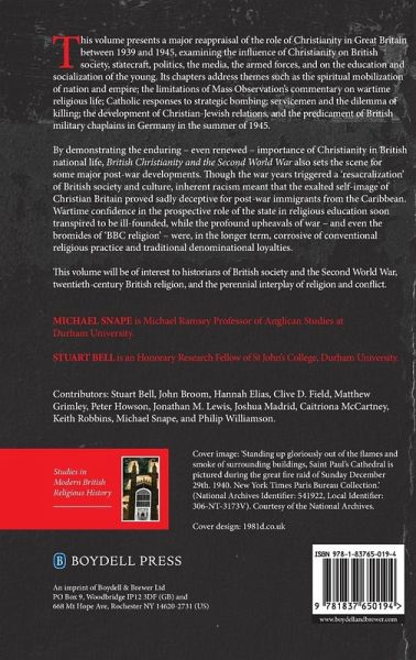 Examines the role of Christianity in British statecraft, politics, media, the armed forces and in the education and socialization of the young during the Second World War. This volume presents a major reappraisal of the role of Christianity in Great Britain between 1939 and 1945, examining the influence of Christianity on British society, statecraft, politics, the media, the armed forces, and on the education and socialization of the young. Its chapters address themes such as the spiritual mobilization of nation and empire; the limitations of Mass Observation's commentary on wartime religious life; Catholic responses to strategic bombing; servicemen and the dilemma of killing; the development of Christian-Jewish relations, and the predicament of British military chaplains in Germany in the summer of 1945. By demonstrating the enduring -even renewed- importance of Christianity in British national life, British Christianity and the Second World War also sets the scene for some major post-war developments. Though the war years triggered a 'resacralization' of British society and culture, inherent racism meant that the exalted self-image of Christian Britain proved sadly deceptive for post-war immigrants from the Caribbean. Wartime confidence in the prospective role of the state in religious education soon transpired to be ill-founded, while the profound upheavals of war -and even the bromides of 'BBC Religion'- were, in the longer term, corrosive of conventional religious practice and traditional denominational loyalties. This volume will be of interest to historians of British society and the Second World War, twentieth-century British religion, and the perennial interplay of religion and conflict.