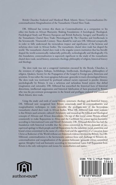 British Churches Enslaved and Murdered Black Atlantic Slaves: Contextualization-De-contextualization-Marginalization of the Transatlantic Chattel Slave Trade. DR. Milwood has written this thesis on Contextualization as a companion to his other two books on African Humanity. Shaking Foundations: A Sociological, Theological, Psychological Study and Western European and British Barbarity, Savagery and Brutality in the Transatlantic Chattel Slave Trade: Homologated By The Churches and Intellectuals in the Seventeenth- Nineteenth Century. These should be read says DR. Milwood synoptically in order to fully understand the tremendous impact and significance of the heinous and nefarious slave trade in African bodies. The transatlantic chattel slave trade has shaped the world. The transatlantic chattel slave trade is the singular system-institution that has literally shaped the world economically, industrially, politically, technologically and theologically. On this foundation, contextualization is supremely significant to the study of the transatlantic chattel slave trade, social history, systematic theology, philosophy of religion, historical history and theology. The slave trade was not a congenial institution executed by the Royals, Churches, ie the ministers of religion, bishops, Archbishops, Intellectuals, theologians, philosophers of religion, Quakers, Society for the Propagation of the Gospel in Foreign parts, intellectuals, historians and scientists. It was rather the most egregious holocaust- genocide in man's chronological history. The slave trade was motivated by profound cultural racism expressed in psychic distance psychologically by Britain. It was a nefarious and nefandous brutal system that defied imagination and rationality. DR. Milwood has unearthed the historical facts of historical distortions, intellectual suppression and historical falsification of facts practiced by Britain who was the pre-eminent protangonists in the brutal and profligate enslaved and murdered Black Atlantic slave trade. Using the study and tools of social history, systematic theology and historical history DR. Milwood now recognized how Britain consciously used de-contextualization and marginalization techniques to make recondite the profligate-ness of the horrendous transatlantic chattel slave trade in African bodies. What DR. Milwood finds most sardonic is that Britain used semantic cultural Christianity and messed up the biblical and theological concepts of Africans and African descendants. On top of this moral crime, Britain refused consistently to make Reparations to Africa and the Caribbean for crimes against humanity according to International Laws and Moral Christianity. DR. Milwood therefore has laid the foundation with historical veritable that the crimes committed by Britain demands an un-equivocal apology to black people and full Reparations for the nefarious, racial, avaricious and brutal crimes committed in the name of a white God and the apparition of a Caucasian Jesus Christ as Redeemer of the World without any historical evidence invented by Britain. For DR. Milwood, contextualization is the hermeneutic cadence-force and challenge to Britain's de-contextualization and marginalization of the greatest holocaust- genocide crimes committed against Almighty God and humanity according to International Laws. Full Reparation from Britain is the only redemption and means for reconciliation and justice.