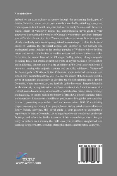 Embark on an extraordinary adventure through the enchanting landscapes of British Columbia, where every corner unveils a world of breathtaking beauty and endless possibilities. From the majestic peaks of the Rocky Mountains to the serene coastal charm of Vancouver Island, this comprehensive travel guide is your gateway to discovering the wonders of Canada's westernmost province. Immerse yourself in the vibrant city life of Vancouver, where a cosmopolitan atmosphere blends seamlessly with awe-inspiring natural surroundings. Explore the historic streets of Victoria, the provincial capital, and uncover its rich heritage and architectural gems. Indulge in the outdoor paradise of Whistler, where thrilling slopes and scenic trails beckon adrenaline seekers and nature enthusiasts alike. Delve into the serene bliss of the Okanagan Valley, where rolling vineyards, glistening lakes, and abundant sunshine create an idyllic backdrop for relaxation and indulgence. Embark on a wildlife encounter in the Great Bear Rainforest, a sanctuary teeming with majestic creatures and unspoiled wilderness. Venture off the beaten path to Northern British Columbia, where untamed landscapes and hidden gems await intrepid travelers. Discover the secrets of the Sunshine Coast, a haven of tranquility and serenity, or dive into the vibrant cultural scene of British Columbia, where museums, art, and festivals ignite the senses. Sample delectable local cuisine, sip on exquisite wines, and browse artisan trails for unique souvenirs. Unleash your adventurous spirit with outdoor activities like hiking, skiing, boating, and kayaking, or simply bask in the beauty of British Columbia's gardens, lakes, and waterways. Embrace sustainability as you journey through this eco-conscious province, promoting responsible travel and conservation. With 35 captivating chapters covering everything from geography and history to indigenous culture and family-friendly activities, this travel guide is your passport to unforgettable experiences in British Columbia. Let its pages inspire your wanderlust, guide your footsteps, and unlock the hidden treasures of this remarkable province. Are you ready to embark on a journey that will leave you breathless, enlightened, and yearning for more? Let the wonders of British Columbia unfold before your eyes.
