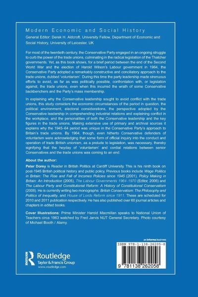 This book examines the a brief period between the end of the Second World War and the election of Harold Wilson's Labour government in 1964, when the Conservative Party adopted a remarkably constructive and conciliatory approach to the trade unions, dubbed 'voluntarism'. During this time the party leadership made strenuous efforts to avoid, as far as was politically possible, confrontation with, or legislation against, the trade unions, even when this incurred the wrath of some Conservative backbenchers and the Party's mass membership. Making extensive use of primary and archival sources it explains why the 1945-64 period was unique in the Conservative Party's relations with the unions, and why, after 1964, things returned to a 'business as usual' confrontational approach.