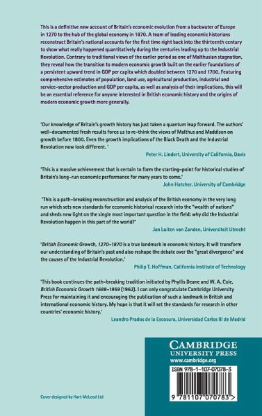 This is a definitive new account of Britain's economic evolution from a backwater of Europe in 1270 to the hub of the global economy in 1870. A team of leading economic historians reconstruct Britain's national accounts for the first time right back into the thirteenth century to show what really happened quantitatively during the centuries leading up to the Industrial Revolution. Contrary to traditional views of the earlier period as one of Malthusian stagnation, they reveal how the transition to modern economic growth built on the earlier foundations of a persistent upward trend in GDP per capita which doubled between 1270 and 1700. Featuring comprehensive estimates of population, land use, agricultural production, industrial and service-sector production and GDP per capita, as well as analysis of their implications, this will be an essential reference for anyone interested in British economic history and the origins of modern economic growth more generally.