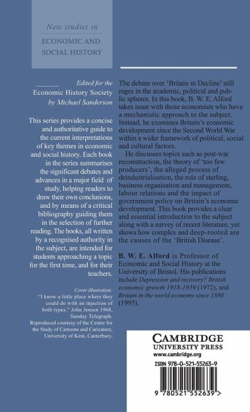 The debate over 'Britain in Decline' is one that still rages in the academic, political and public spheres. In this concise study, B. W. E. Alford takes issue with those economists who have a mechanistic approach to the subject. Instead, he examines Britain's economic development since the Second World War within a wider framework of political, social and cultural factors. He discusses topics such as post-war reconstruction, the theory of 'too few producers', the alleged process of de-industrialisation, the role of sterling, business organisation and management, labour relations and the impact of government policy on Britain's economic development. Professor Alford provides a clear introduction to the subject along with a survey of recent literature, yet shows how complex and deep-rooted are the causes of the 'British Disease'.